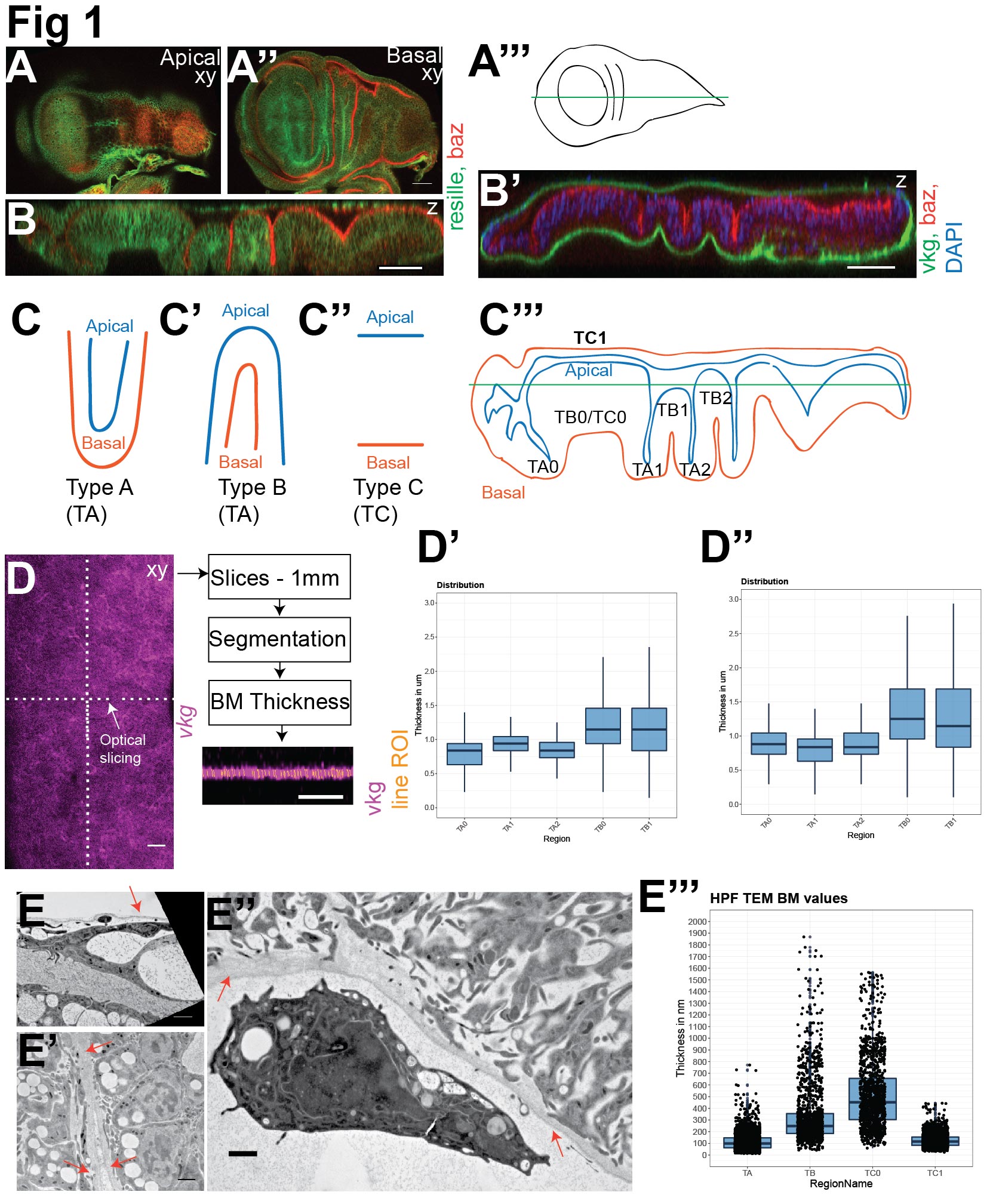 How epithelial cells are organized in three dimensions during tissue morphogenesis is poorly understood. In the Drosophila wing imaginal disc, we examined the material factors and mechanical processes that determine the shape of epithelial cells. Since all cells are deposited on a basement membrane which influences the mechanics intracellularly, we reexamined the properties of this structure with fluorescence and transmission electron microscopy. We found regions in which the basement membrane is much thicker than previously reported. We propose that these thickness patterns determine the height and basal surface area of cells and the curvature of the folds in the wing disc. Further, we examined the effect on cell shape and tissue mechanics when disruptions were instigated, at three different time scales: short (seconds, with laser cutting), medium (minutes, with drug treatments) and long (days, with RNAi interference). Disrupting the actin cytoskeleton through drug treatment affects cell shape only at the apical surface while the shapes in the medial plane and at the basal surface were not altered. In contrast, when integrin function was disrupted via RNAi or basement membrane integrity was abolished by drug treatment, medial and basal cell shapes were affected. Based on these findings and previous studies we propose a model of how cell shapes and tissue properties are determined with highly local and modular apical and basal mechanics.